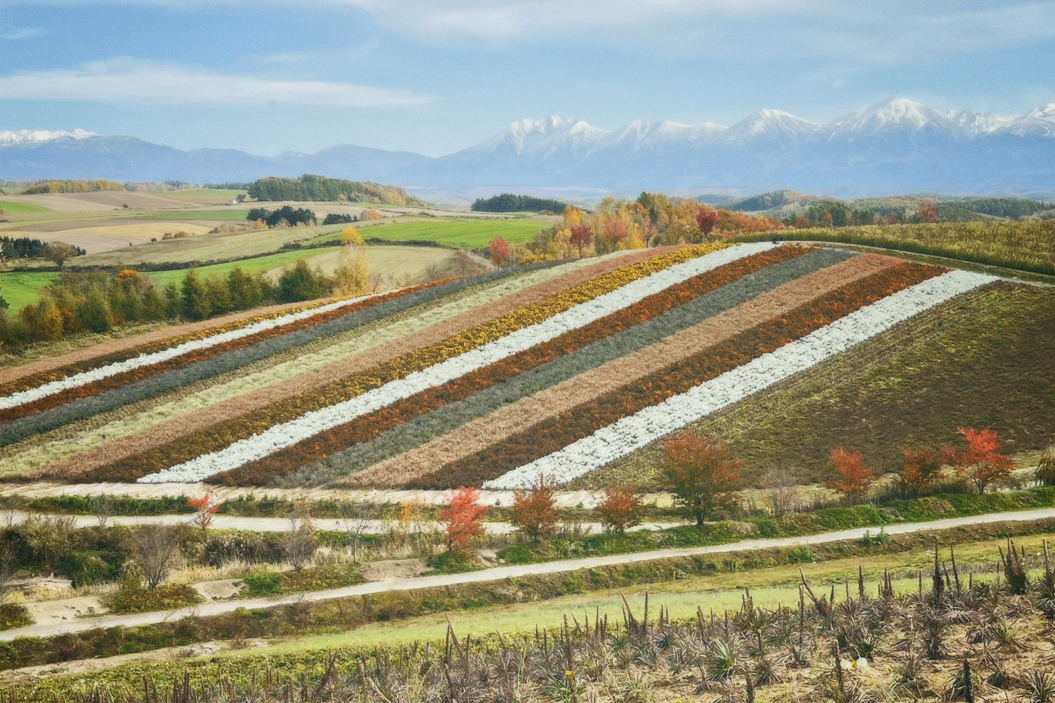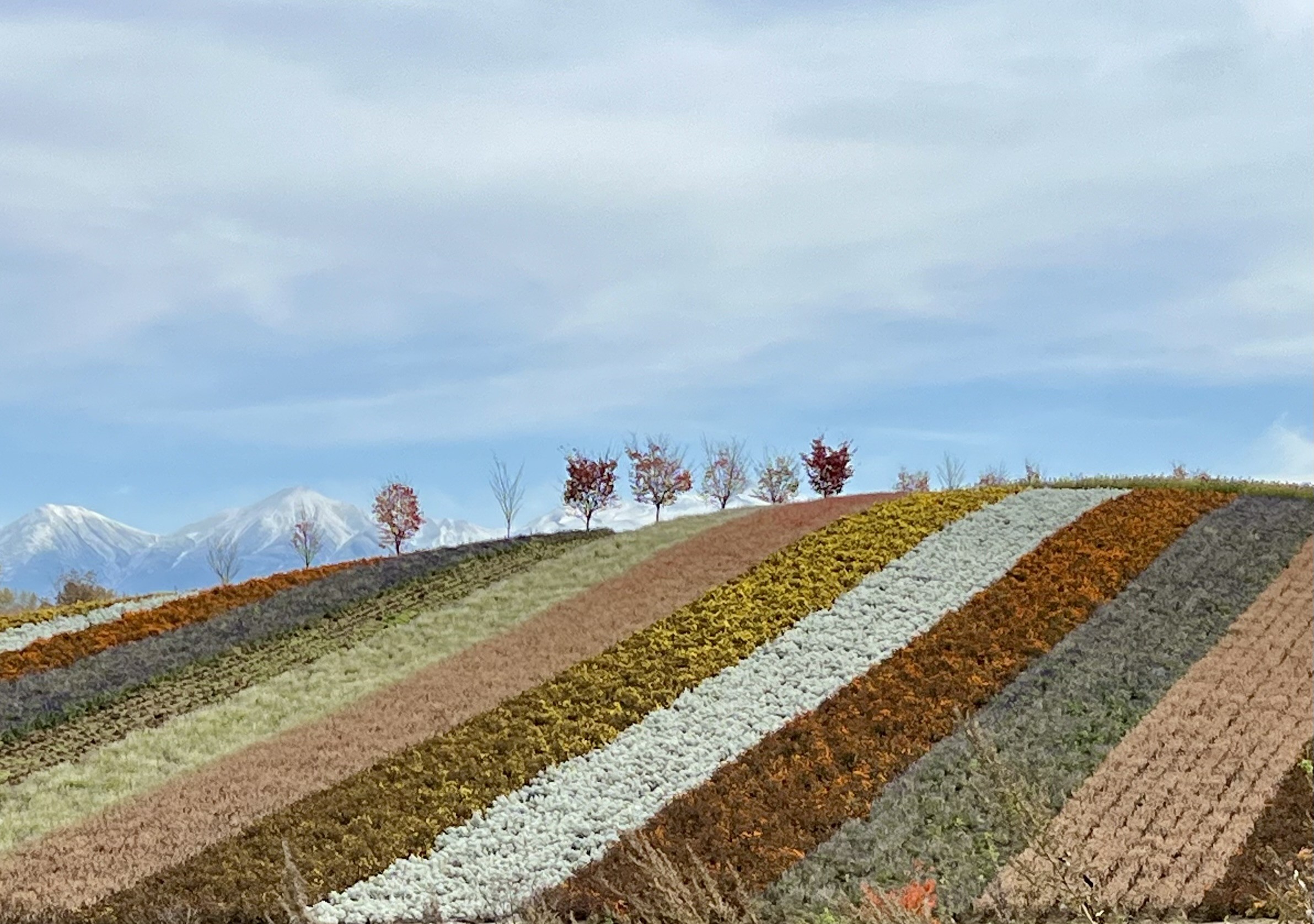 在四季彩の丘逛了一个小时。这季节花色没那么鲜明了(连带着入园免费,虽然我看得开心就按要求捐了200日元),可是远处有雪山了呀!