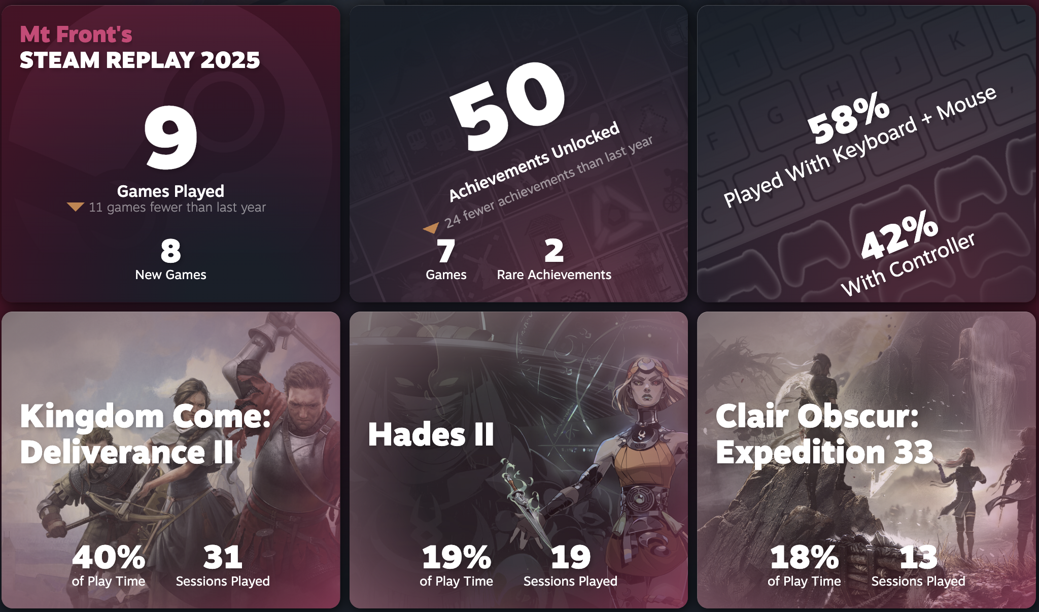 今年的游戏量真是断崖式下跌(而且去年比前年也是下跌了不少了已经)……认真玩了的也就(依次) KCD2,Split Fiction,Hades II,燕云十六声和 33