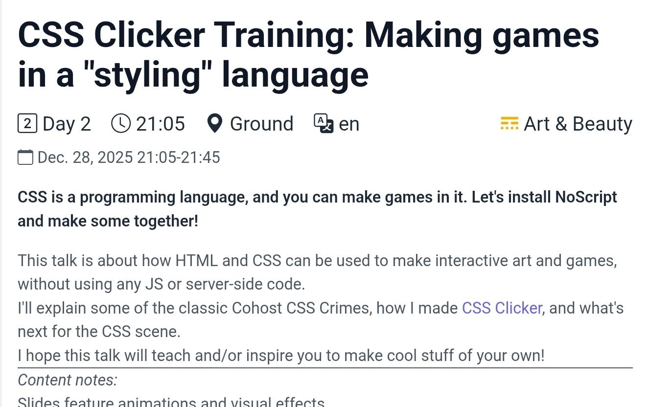 i'm still working on the slides, so if you have any CSS crimes or techniques you'd like to see explained please let me know! it can be both cohost and general CSS crimes & stuff!