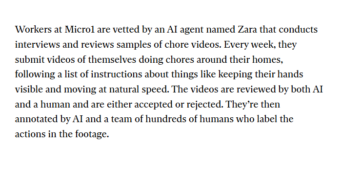 <p>Dystopian.</p><p><a href="https://www.technologyreview.com/2026/04/01/1134863/humanoid-data-training-gig-economy-2026-breakthrough-technology/" rel="nofollow" class="ellipsis" title="www.technologyreview.com/2026/04/01/1134863/humanoid-data-training-gig-economy-2026-breakthrough-technology/"><span class="invisible">https://</span><span class="ellipsis">www.technologyreview.com/2026/</span><span class="invisible">04/01/1134863/humanoid-data-training-gig-economy-2026-breakthrough-technology/</span></a></p><p>via <a href="https://flipboard.com/@thenewsdesk/technology-shjum1jiz/-/a-C6tPZBTVTxqHxInIhLyDEw%3Aa%3A43591897-%2F0" rel="nofollow" class="ellipsis" title="flipboard.com/@thenewsdesk/technology-shjum1jiz/-/a-C6tPZBTVTxqHxInIhLyDEw%3Aa%3A43591897-%2F0"><span class="invisible">https://</span><span class="ellipsis">flipboard.com/@thenewsdesk/tec</span><span class="invisible">hnology-shjum1jiz/-/a-C6tPZBTVTxqHxInIhLyDEw%3Aa%3A43591897-%2F0</span></a></p><p><a href="/tags/news/" rel="tag">#news</a> <a href="/tags/technology/" rel="tag">#technology</a> <a href="/tags/technews/" rel="tag">#TechNews</a> <a href="/tags/ai/" rel="tag">#AI</a> <a href="/tags/robots/" rel="tag">#robots</a> <a href="/tags/automation/" rel="tag">#automation</a></p>