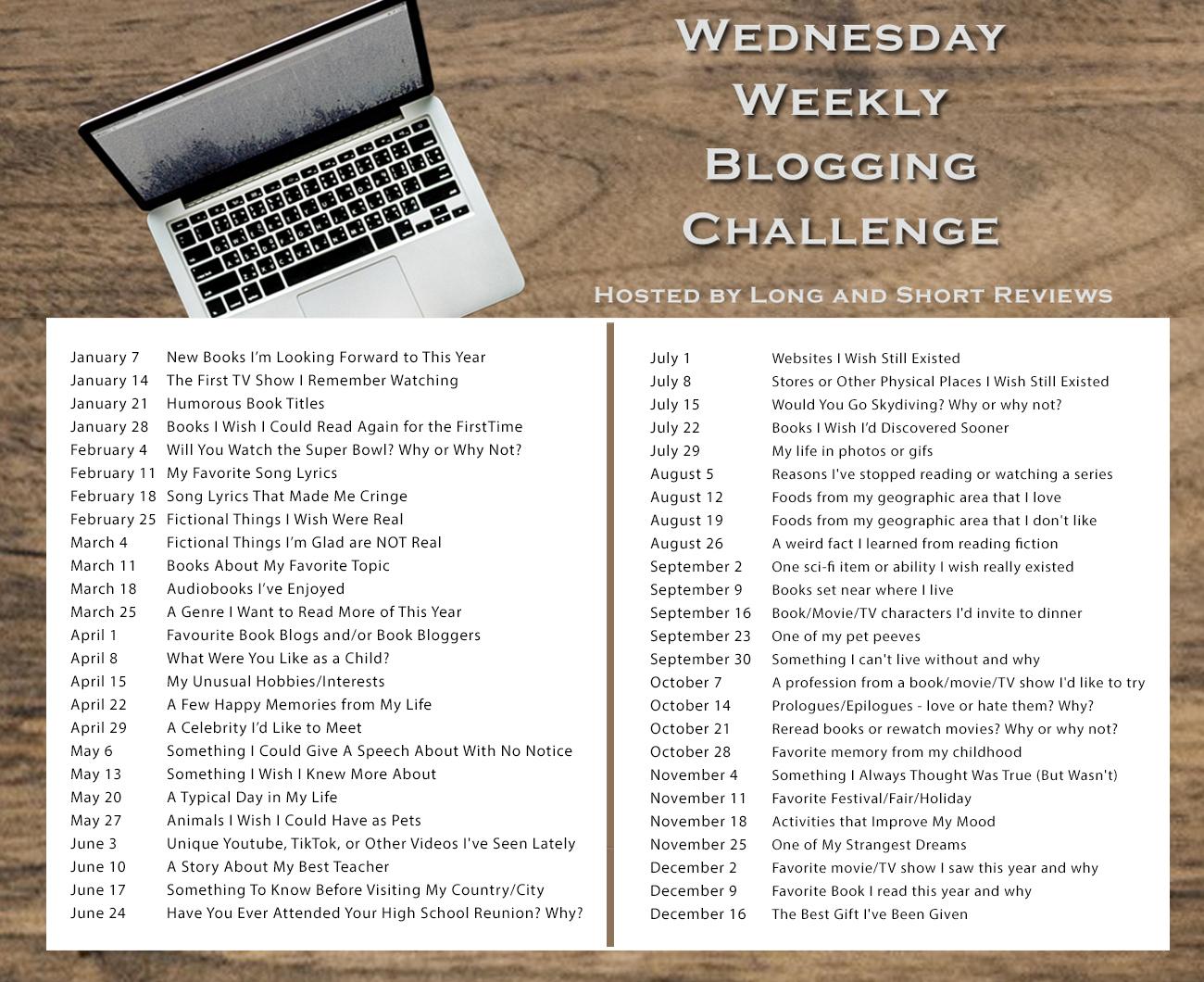 Bookish and blogging friends, The 2026 Wednesday Weekly Blogging Challenge blog hop topics are available now. The first one happens on January 7.