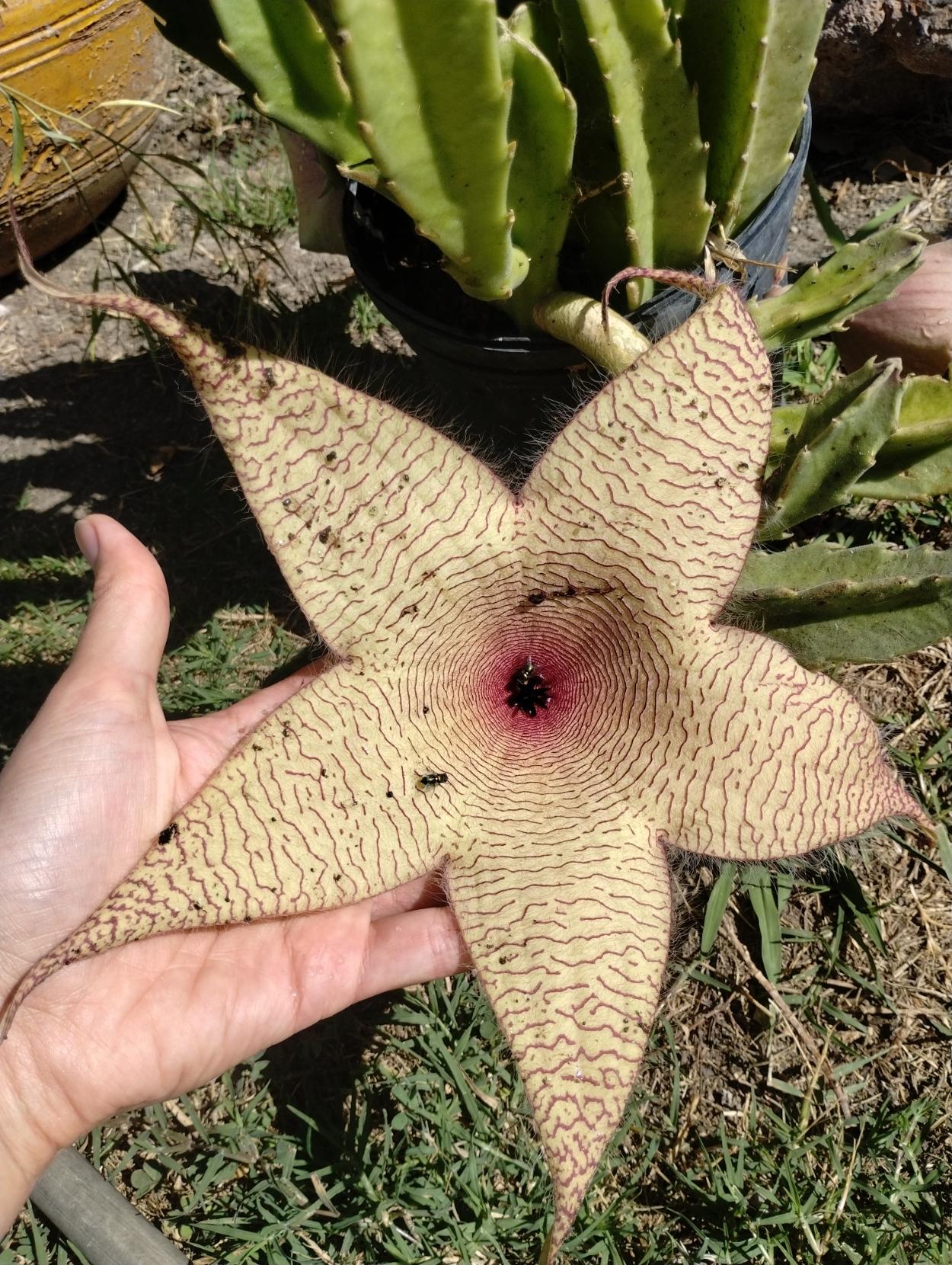 My stinky starfish flower opened! This is the most disgusting flower I've ever grown. There are flies crawling all over it and it's also covered in hair like it's made out of animal flesh.