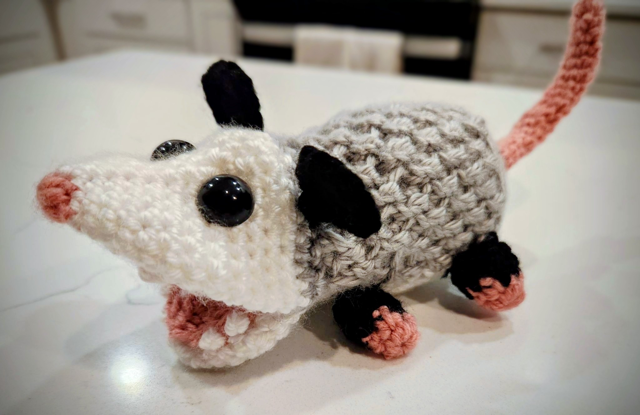 Made a screaming opossum for a Christmas gift. 12 fiddly pieces to sew together, but I think it turned out pretty well!