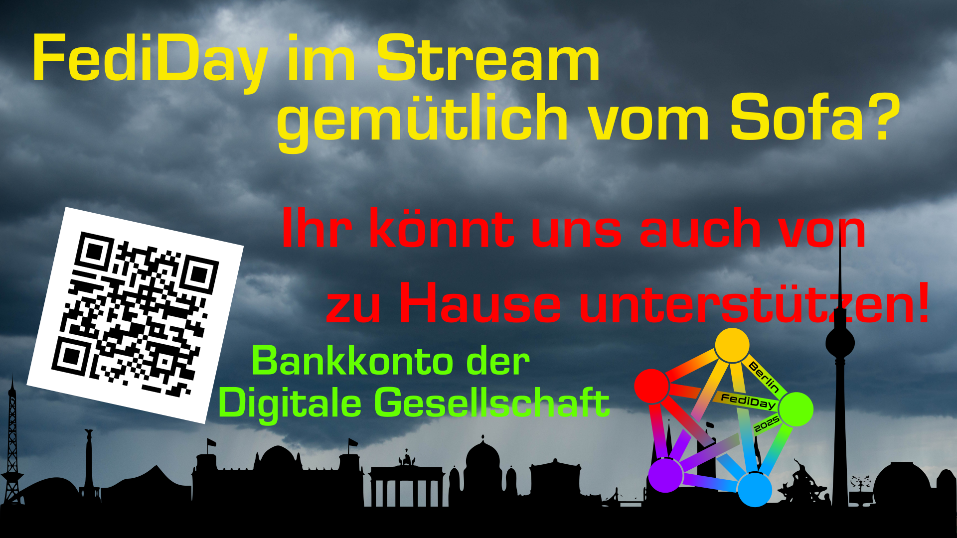 Der #FediDay ist eine No-Budget-Veranstaltung. Ob Orga-Crew, Sprecher_innen oder Engel, wir machen das aus Überzeugung. Trotzdem haben wir Kosten, die wir nur zum kleinen Teil über Tickets und Unterstützung von außen stemmen können. Ihr helft uns enorm, wenn ihr uns noch eine Spende zukommen lasst.
