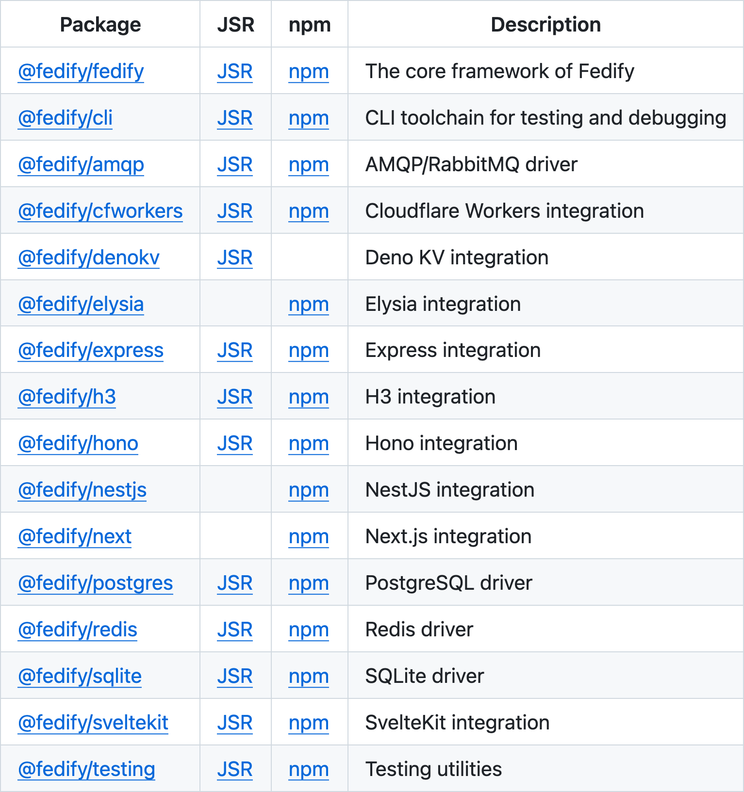 Each package is available on JSR and/or npm, making it easy to pick exactly what you need for your ActivityPub implementation.