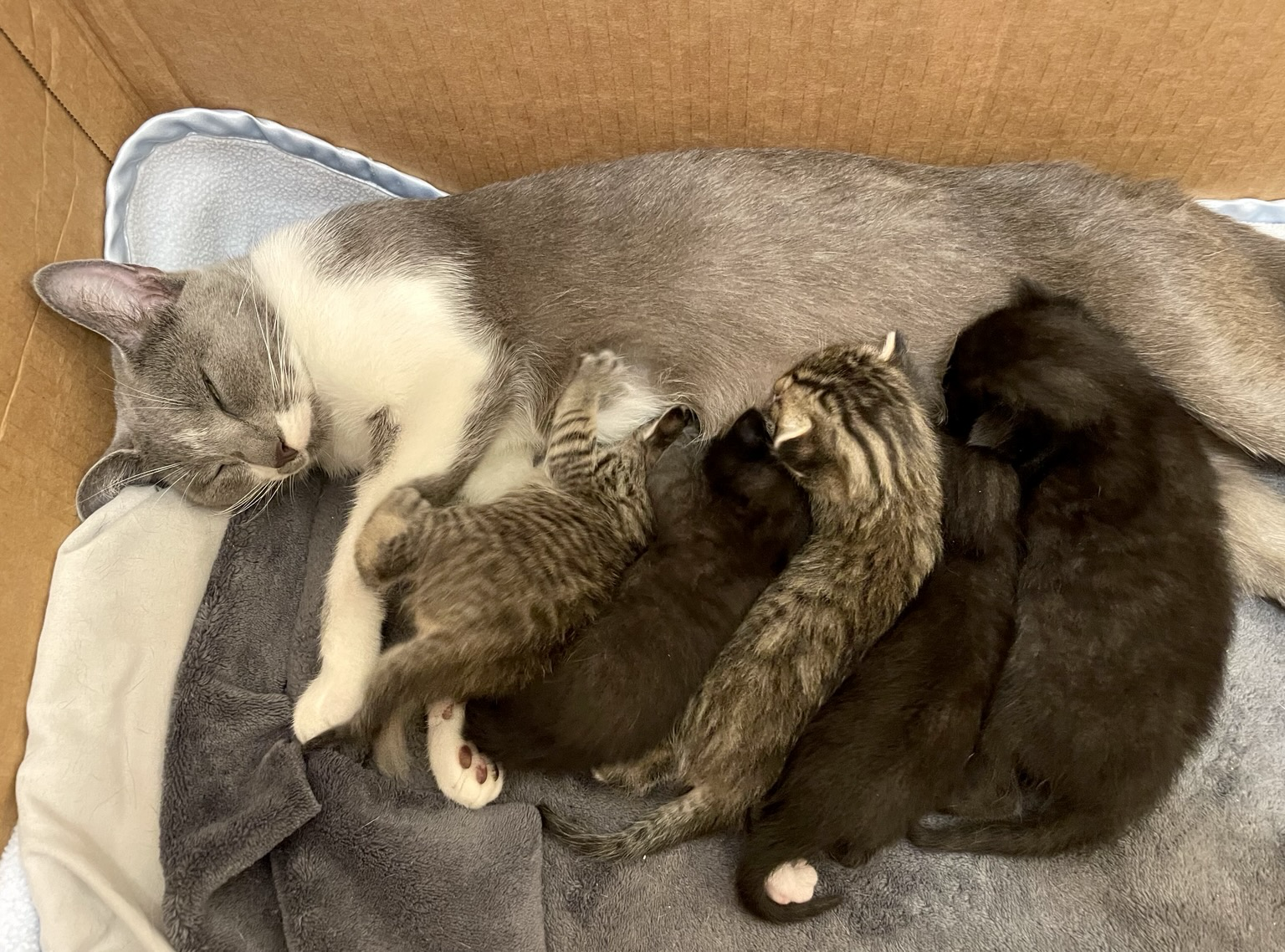 Mama loving on her family with a close up of the littlest two 💖 #FosterKittens #cats #caturday #CatsOfMastodon #love