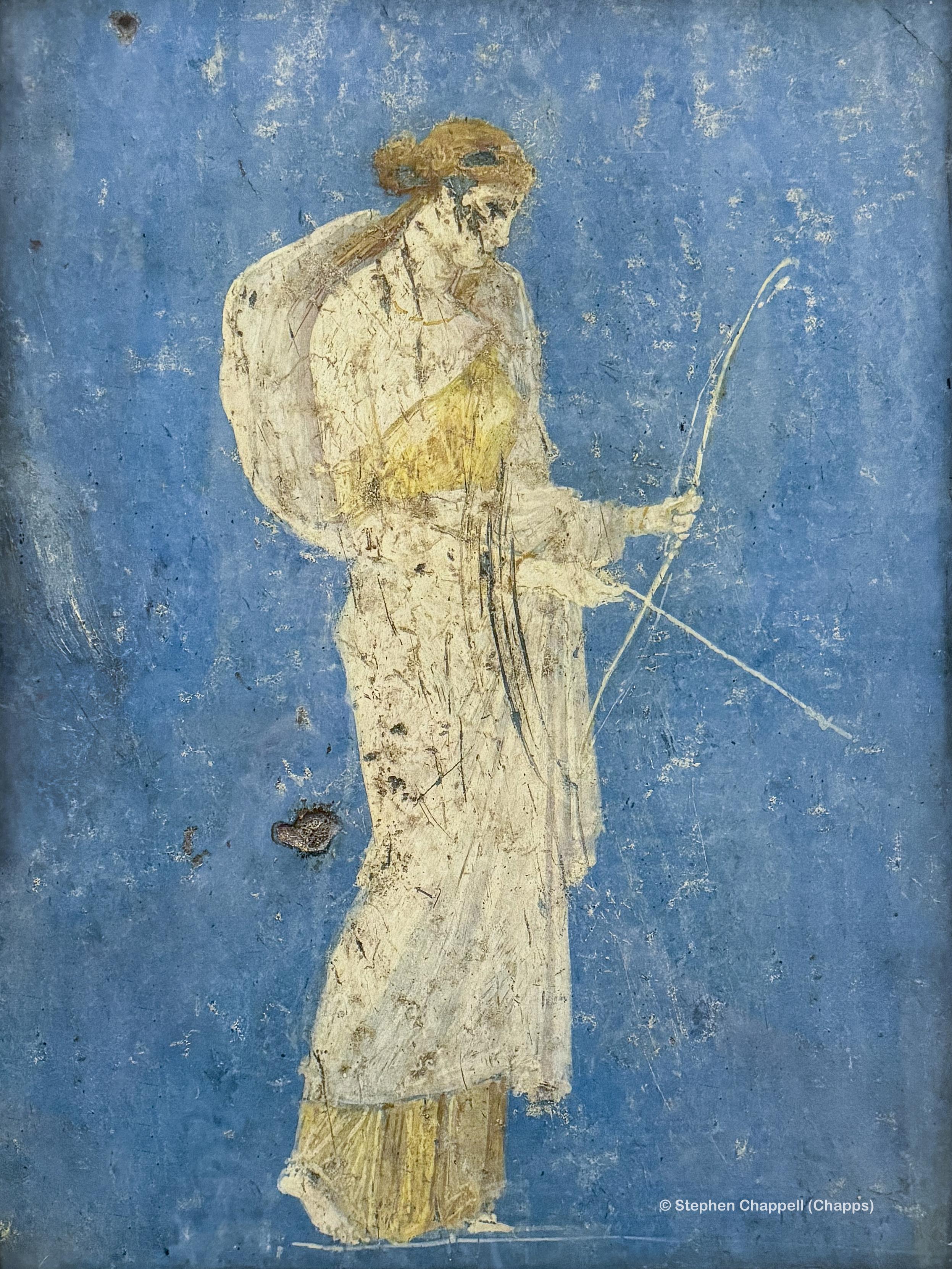 The goddess of the hunt prepares her bow and arrow in this scene from the Villa Arianna in Stabiae and now held by the MAN Napoli. The gorgeous blue of the background sets the golden yellow hues of Diana’s gown off in delicious contrast drawing attention to just how vibrant the colours could be in ancient Roman art.