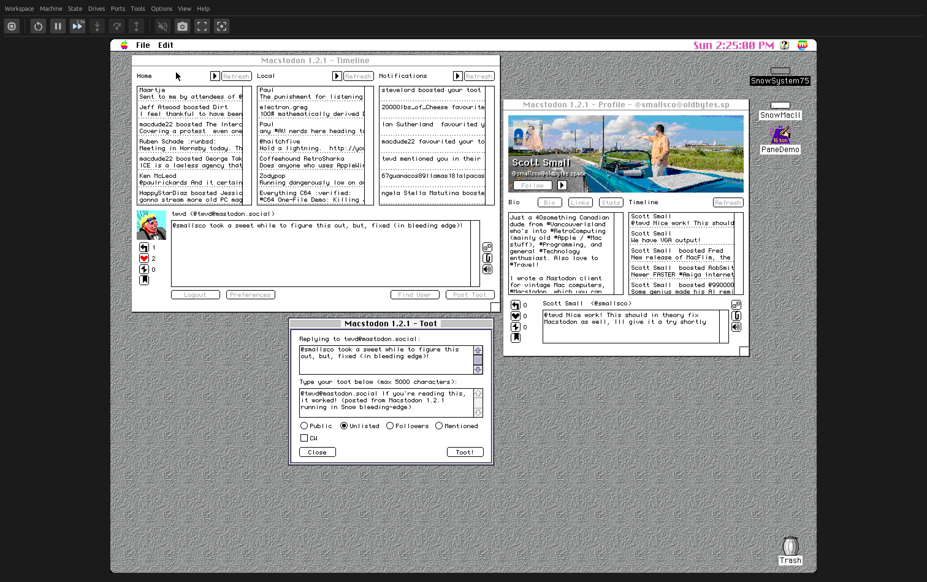 #Macstodon now runs in the latest bleeding-edge build of the Snow emulator! And if you use Snow's built-in HTTPS stripping, then you don't have to configure WebOne or another proxy, just install Macstodon and start using it 😎