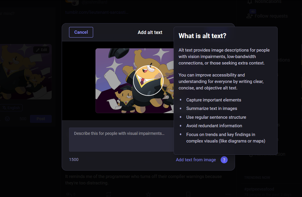 With today's update, we've improved the look of the alt text modal you see when composing new posts on #Mastodon, and added some information about the significance of alt text for accessibility and how to write it.