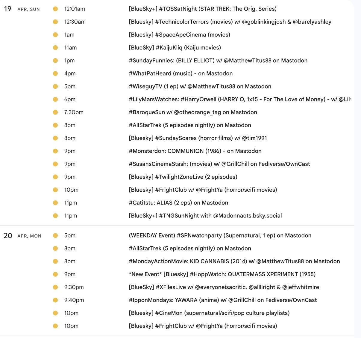 <p>🐣🐇It's the weekly <a href="/tags/mastodon/" rel="tag">#Mastodon</a>/ <a href="/tags/fediverse/" rel="tag">#Fediverse</a> <a href="/tags/watchpartycalendar/" rel="tag">#WatchPartyCalendar</a> screencap 📺</p><p>April 2-9 (Thu-Thu)</p><p>More <a href="/tags/ripchucknorris/" rel="tag">#RIPChuckNorris</a> on <a href="/tags/kungfusat/" rel="tag">#KungFuSat</a> & <a href="/tags/mondayactionmovie/" rel="tag">#MondayActionMovie</a></p><p><a href="/tags/columbotv/" rel="tag">#ColumboTV</a> on 4/4</p><p><a href="/tags/harryorwell/" rel="tag">#HarryOrwell</a> returns 4/5</p><p>📅Details &🔗s ➡️ <a href="http://bit.ly/MastodonWatchParties" rel="nofollow"><span class="invisible">http://</span>bit.ly/MastodonWatchParties</a><br>⏰️All times US Eastern</p><p><a href="/tags/westerns/" rel="tag">#Westerns</a> <a href="/tags/music/" rel="tag">#Music</a> <a href="/tags/mysteries/" rel="tag">#Mysteries</a> <a href="/tags/action/" rel="tag">#Action</a> <a href="/tags/comedy/" rel="tag">#Comedy</a> <a href="/tags/anime/" rel="tag">#anime</a> <a href="/tags/movies/" rel="tag">#Movies</a> <a href="/tags/filmmastodon/" rel="tag">#FilmMastodon</a> <a href="/tags/cinemastodon/" rel="tag">#CineMastodon</a> <a href="/tags/watchpartyalert/" rel="tag">#WatchPartyAlert</a></p><p>Thx hosts <span class="h-card"><a href="https://mastodon.social/@MatthewTitus88" class="u-url mention" rel="nofollow noopener noreferrer" target="_blank">@<span>MatthewTitus88</span></a></span> <span class="h-card"><a href="https://universeodon.com/@MirrorAyako" class="u-url mention" rel="nofollow noopener noreferrer" target="_blank">@<span>MirrorAyako</span></a></span> <span class="h-card"><a href="https://timeloop.cafe/@Taweret" class="u-url mention" rel="nofollow noopener noreferrer" target="_blank">@<span>Taweret</span></a></span> <span class="h-card"><a href="https://mastodon.social/@analgesicsleep" class="u-url mention" rel="nofollow noopener noreferrer" target="_blank">@<span>analgesicsleep</span></a></span> <span class="h-card"><a href="https://mastodon.social/@rsmon77" class="u-url mention" rel="nofollow noopener noreferrer" target="_blank">@<span>rsmon77</span></a></span> <span class="h-card"><a href="https://lazybear.social/@hyde" class="u-url mention" rel="nofollow noopener noreferrer" target="_blank">@<span>hyde</span></a></span> <span class="h-card"><a href="https://mastodon.social/@greenpepper22" class="u-url mention" rel="nofollow noopener noreferrer" target="_blank">@<span>greenpepper22</span></a></span> <span class="h-card"><a href="https://dmv.community/@kamikat" class="u-url mention" rel="nofollow noopener noreferrer" target="_blank">@<span>kamikat</span></a></span> <span class="h-card"><a href="https://mastodon.social/@lilymarswrites" class="u-url mention" rel="nofollow noopener noreferrer" target="_blank">@<span>lilymarswrites</span></a></span> <span class="h-card"><a href="https://mastodon.social/@heavydishongry" class="u-url mention" rel="nofollow noopener noreferrer" target="_blank">@<span>heavydishongry</span></a></span></p>