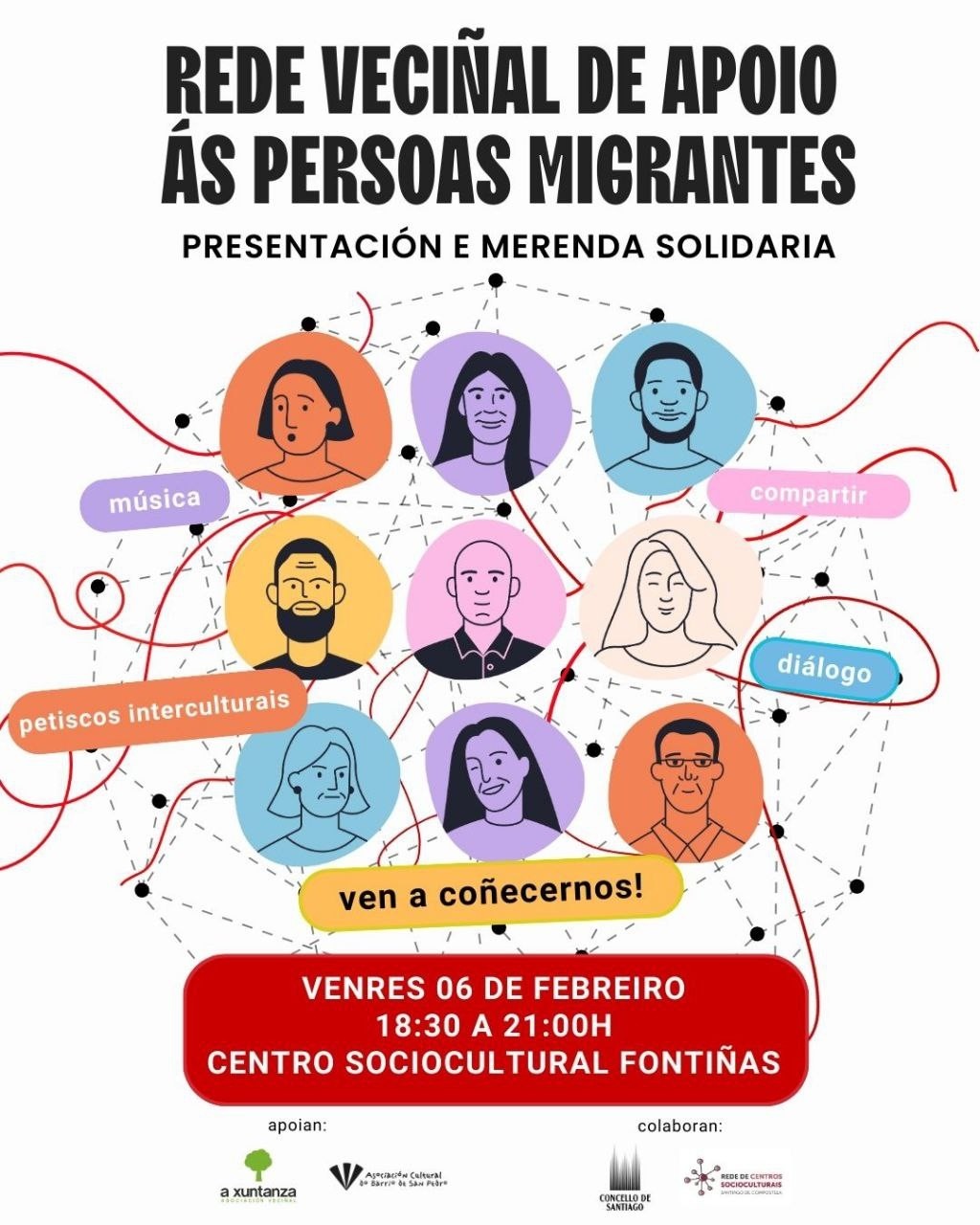 Amanhã, sexta-feira 6 de fevereiro, de 18h30 a 21h00, no centro sociocultural das Fontinhas, apresentação (e merenda) da Rede vecinhal de apoio às pessoas migrantes 💪🥳 Organizada pola Asociación veciñal A Xuntanza e a Asociación cultural do Barrio de San Pedro.