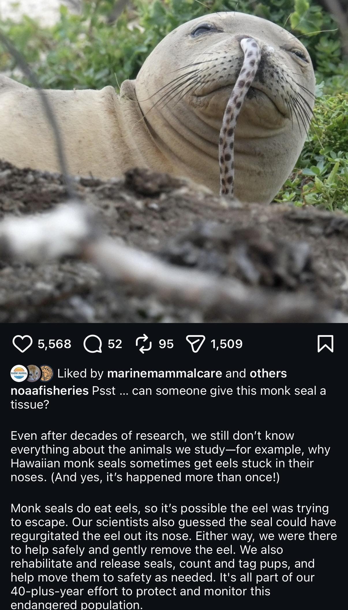<p>Monk seals sometimes get eels stuck up their nose. We still don’t know why </p><p><a href="/tags/marine/" rel="tag">#Marine</a> <a href="/tags/pinnepeds/" rel="tag">#Pinnepeds</a> <a href="/tags/science/" rel="tag">#Science</a></p>