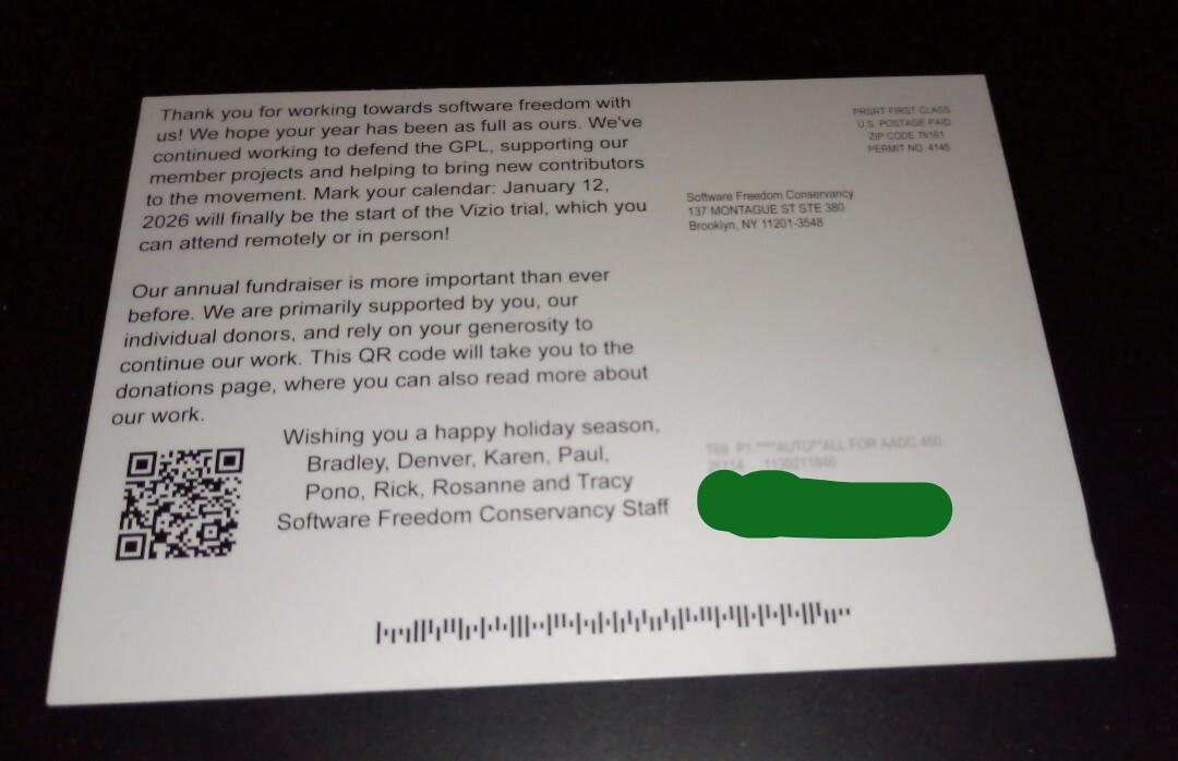Just followed the Software Free Conservancy after receiving a postcard from
