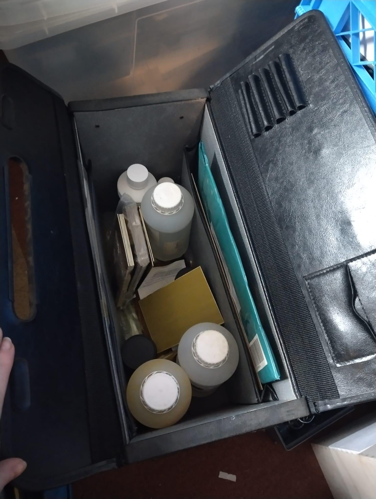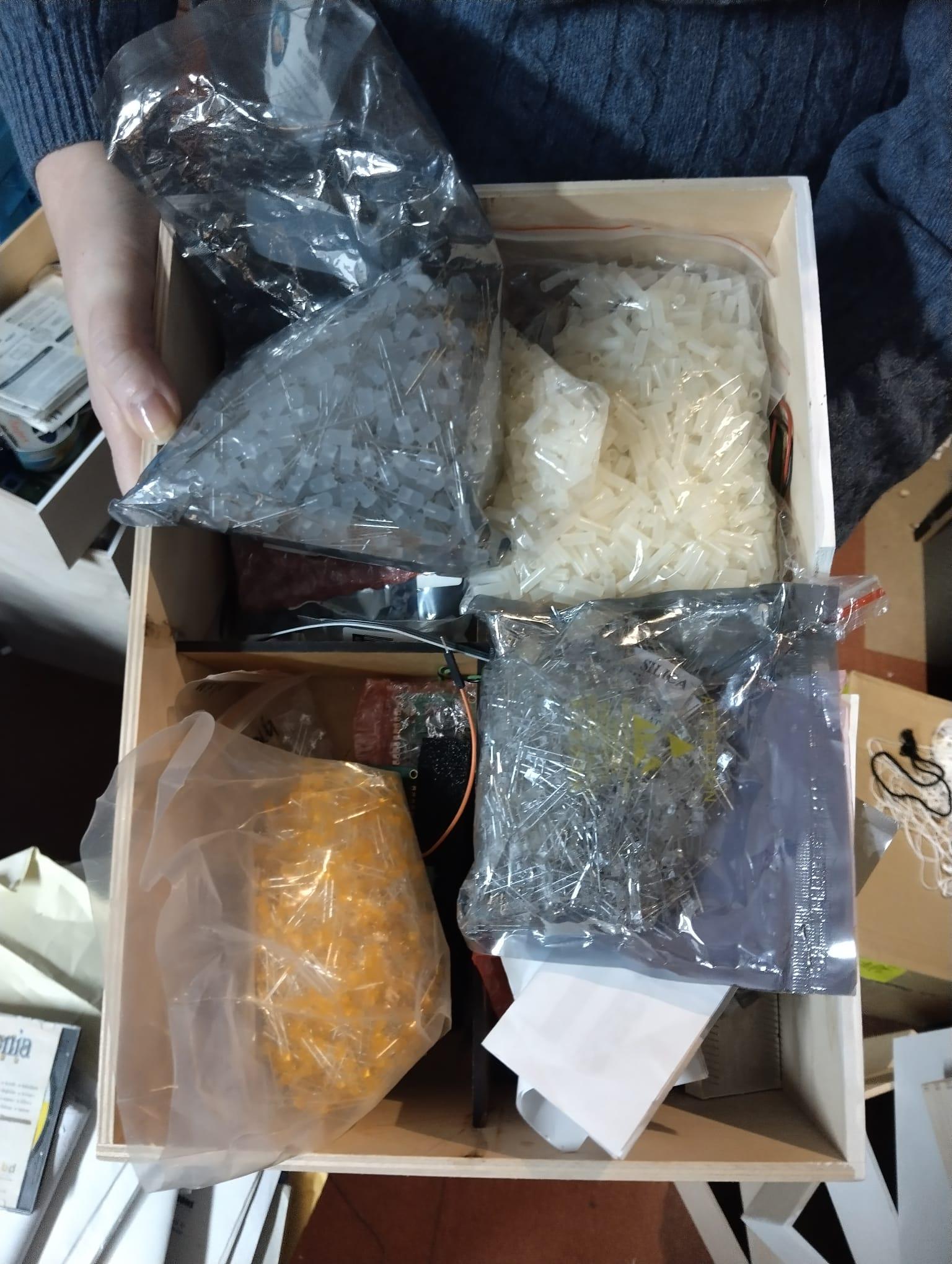 Production artefacts; holders made of PCB material and other magical things that you need once during assembly. Books on programming. Kilos of steel nuts. Odroids and Teensies.