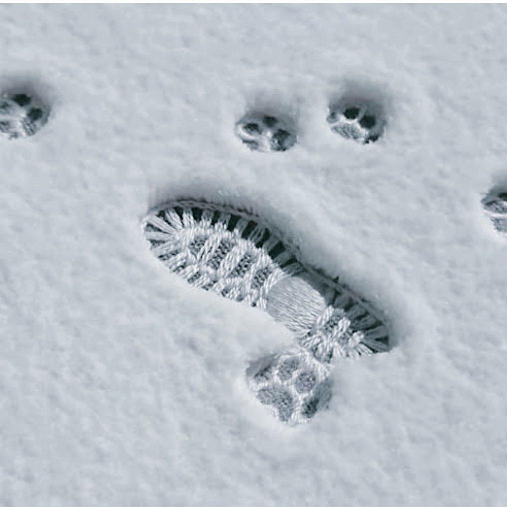 Japanese artist Narumi Takada's 2021 embroidery piece, "Stepping on Fresh Snow" with snow created using punch needle and straight/satin stitches for the boot and paw prints