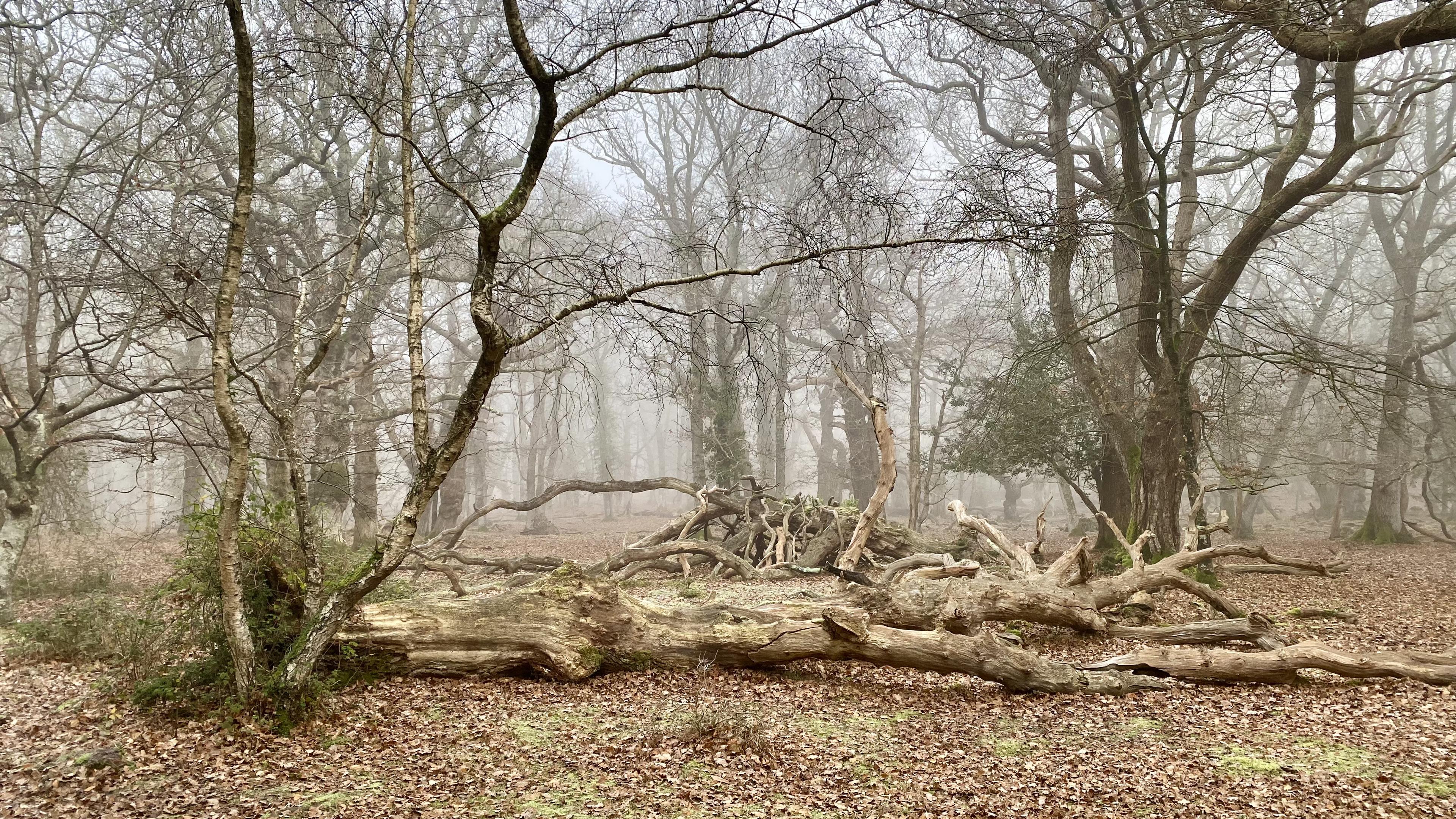 A photograph taken on a cold and misty January morning at Hawkhill Inclosure, near Beaulieu, in the New Forest, UK.