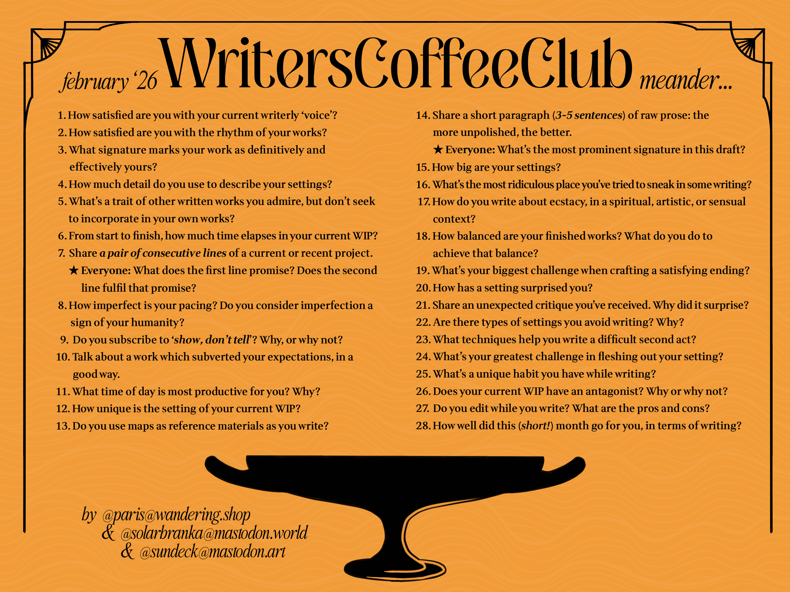 Good morning, writers of #writersCoffeeClub! It’s the end of a month, and you know what that means: September’s prompts are up! As always, a text-only version of the prompt list can be found on my blog: https://sulfur.ink/wcc-september-2025/